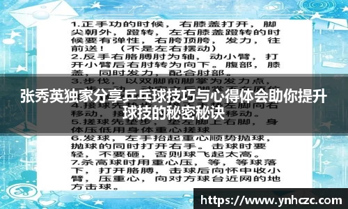 在乒乓球这项运动中,技巧与经验的积累是至关重要的。张秀英作为一位经验丰富的乒乓球爱好者,将自己多年来在训练和比赛中的心得体会进行了总结和分享。本文将从四个方面深入探讨她所传授的独家技巧,包括基本击球技术、战术思维、心理素质以及日常训练方法。这些内容不仅适合初学者,也能帮助中高级选手提升自己的水平。通...